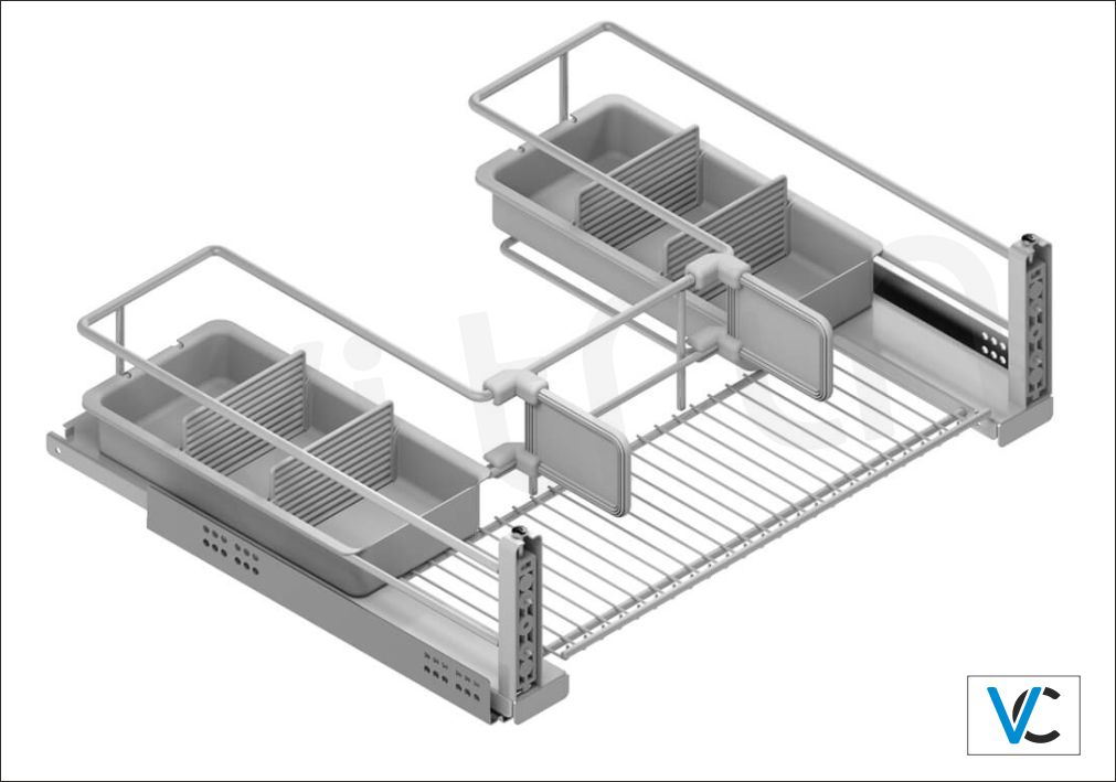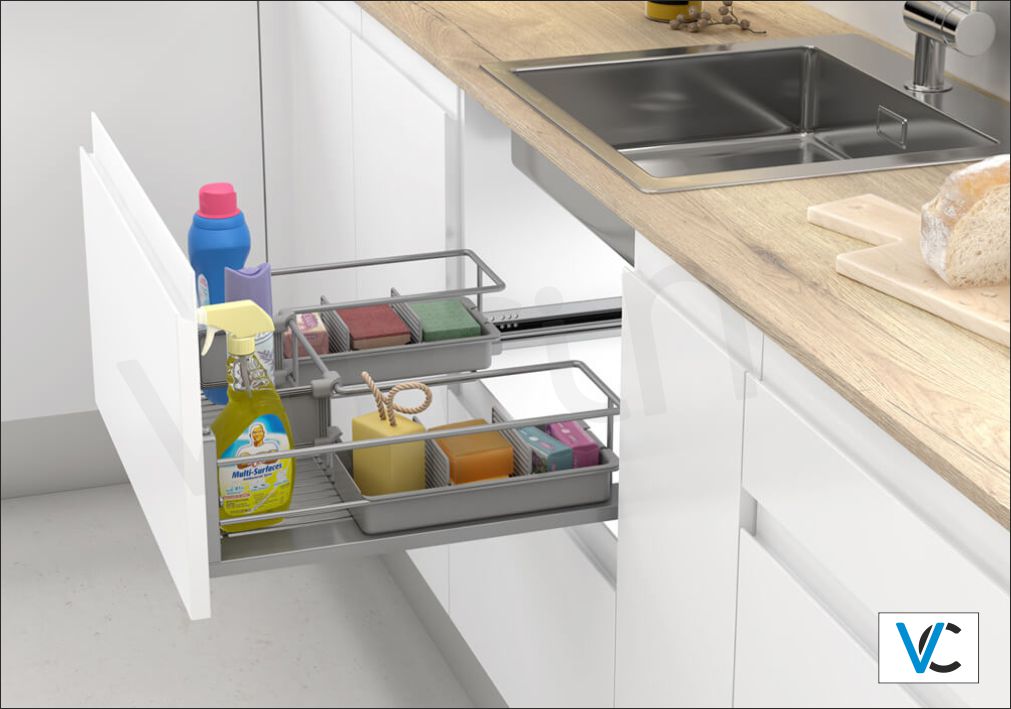 Τρίπλευρο συρμάτινο συρτάρι με φρένο, για τοποθέτηση κάτω από νεροχύτη, σε δυο μεγέθη με αξεσουάρ.