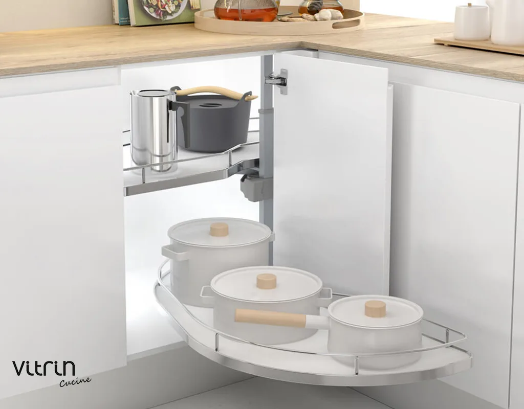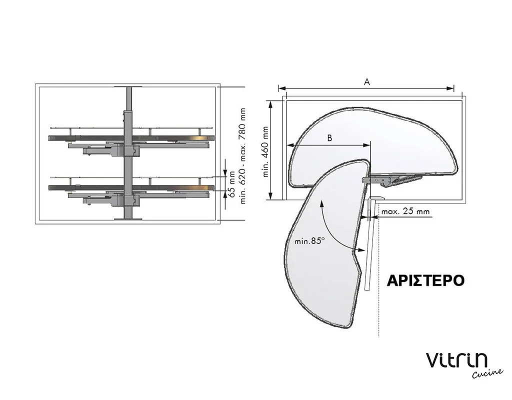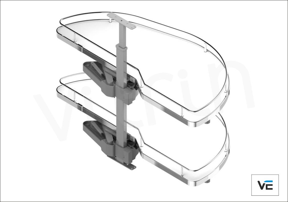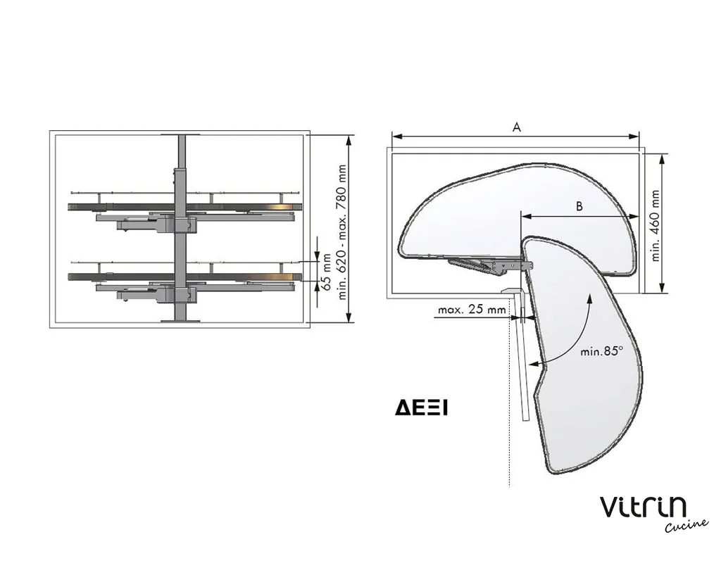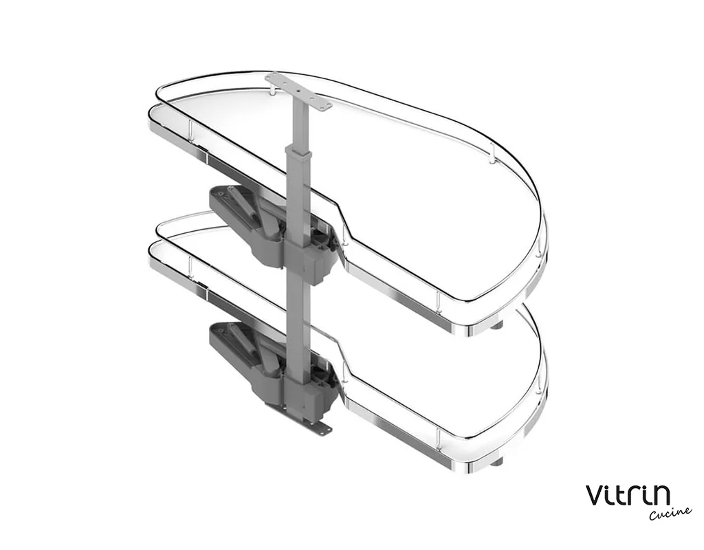 Αυτόματη σκευοθήκη Dolphin, σε μοντέρνα απόχρωση γραφίτη, δεξιά και αριστερή, σε τρία μεγέθη. Εκμεταλλευτείτε πλήρως τα γωνιακά ντουλάπια της κουζίνας, με άνετη πρόσβαση στο εσωτερικό τους, χρησιμοποιώντας την καινοτόμα λύση της MENAGE CONFORT. Η αυτόματη σκευοθήκη Dolphin για «τυφλά» ντουλάπια κουζίνας διαθέτει νέο μηχανισμό με υδραυλικά φρένα στο άνοιγμα και στο κλείσιμο. Με πάτο μελαμίνης και περίβλημα από ατσάλι, μπορεί να αποθηκεύσει σκεύη συνολικού βάρους έως 40kg. Είναι πανεύκολη στην τοποθέτηση με πολλαπλές ρυθμίσεις καθ’ ύψος.