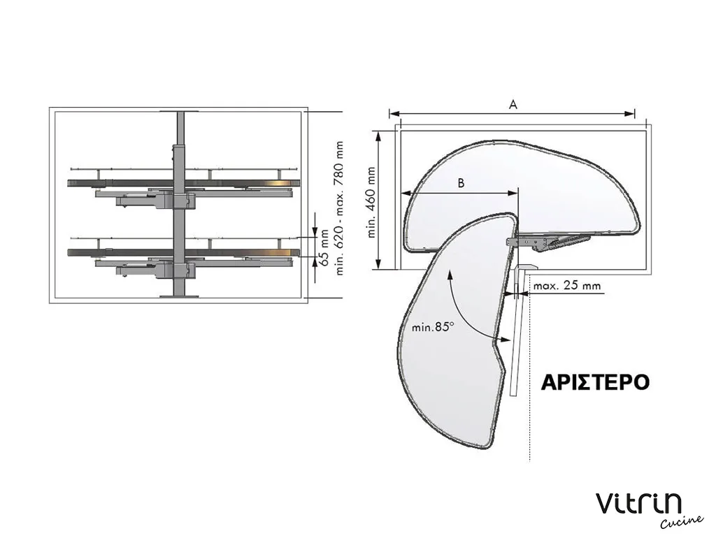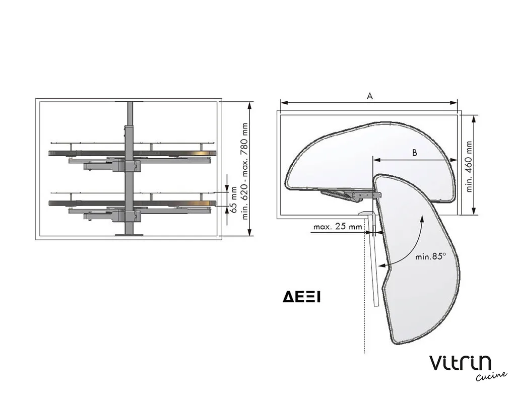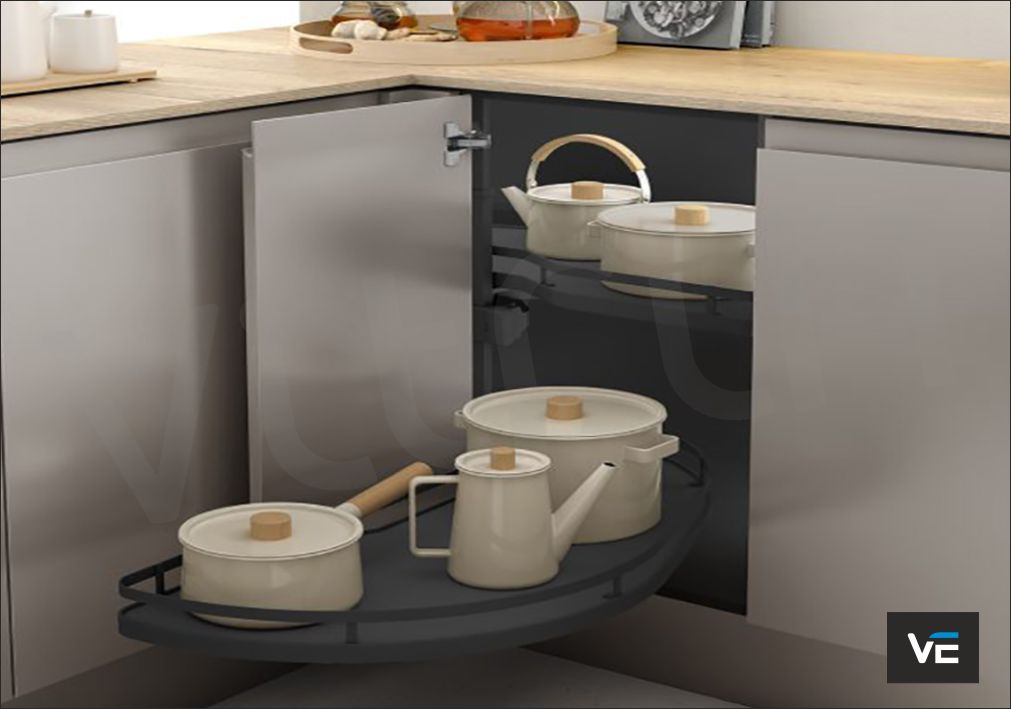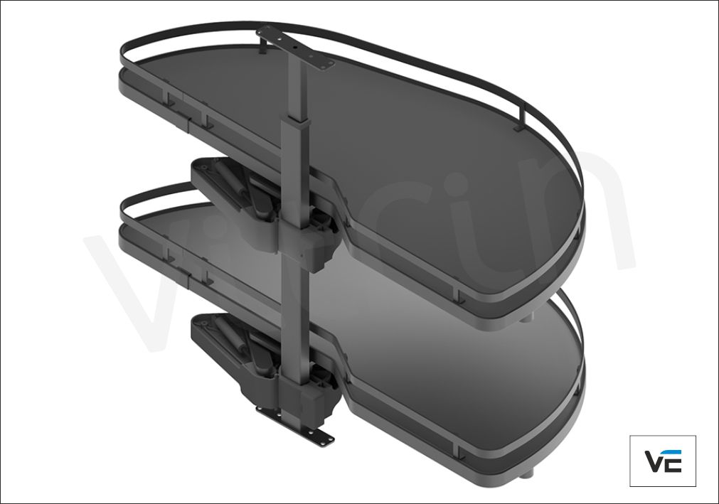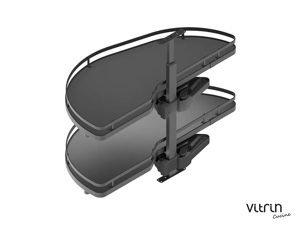 Αυτόματη σκευοθήκη Dolphin, σε μοντέρνα απόχρωση γραφίτη, δεξιά και αριστερή, σε τέσσερα μεγέθη. Εκμεταλλευτείτε πλήρως τα γωνιακά ντουλάπια της κουζίνας, με άνετη πρόσβαση στο εσωτερικό τους, χρησιμοποιώντας την καινοτόμα λύση της MENAGE CONFORT. Η αυτόματη σκευοθήκη Dolphin για «τυφλά» ντουλάπια κουζίνας διαθέτει νέο μηχανισμό με υδραυλικά φρένα στο άνοιγμα και στο κλείσιμο. Με πάτο μελαμίνης και περίβλημα από ατσάλι, μπορεί να αποθηκεύσει σκεύη συνολικού βάρους έως 40kg. Είναι πανεύκολη στην τοποθέτηση με πολλαπλές ρυθμίσεις καθ’ ύψος.